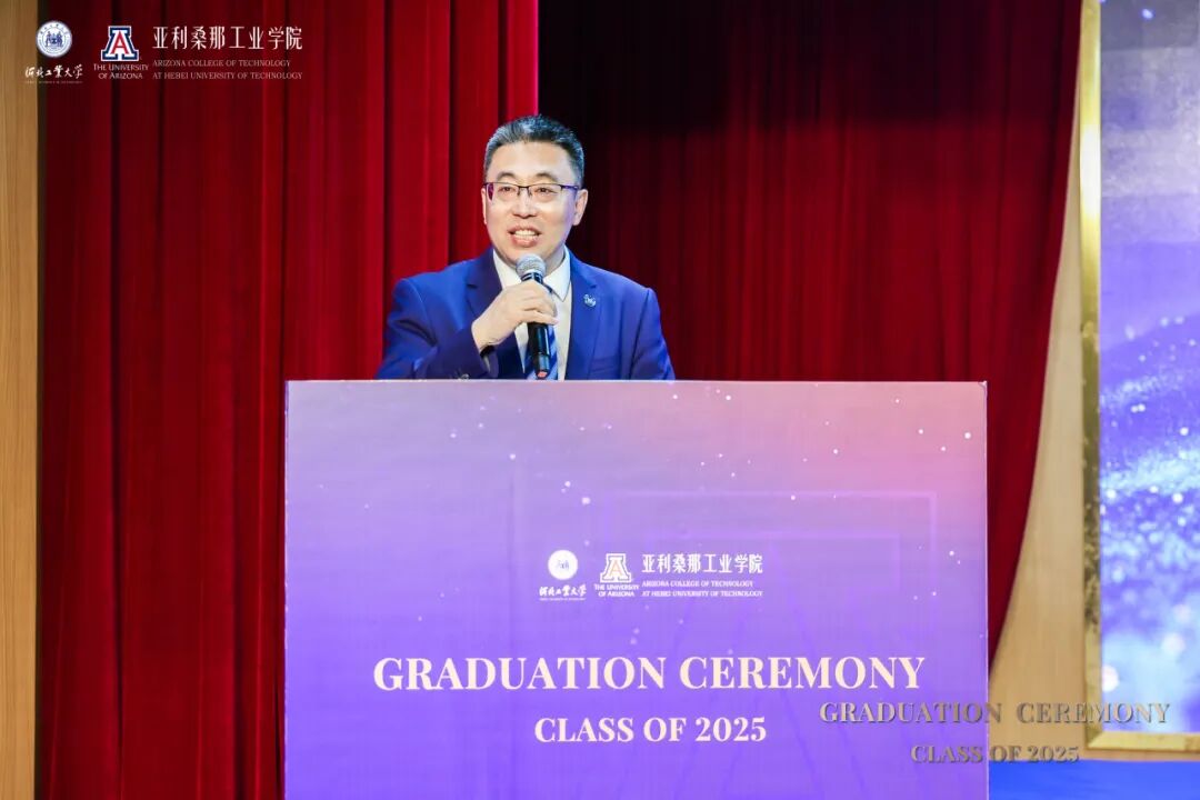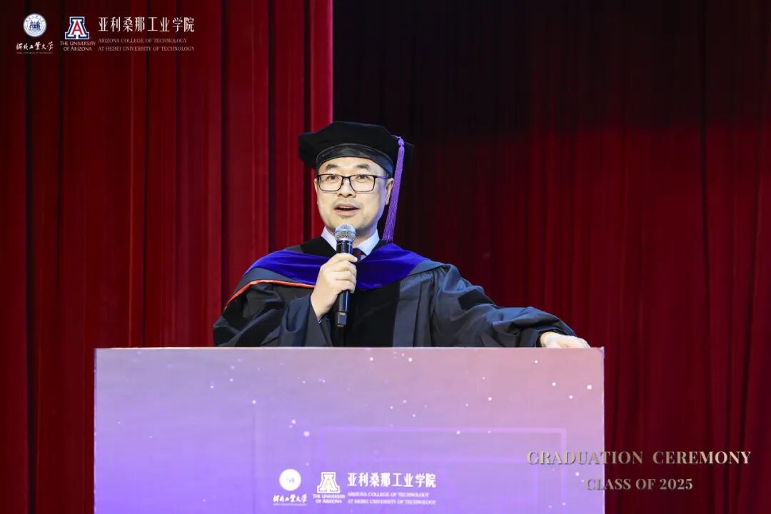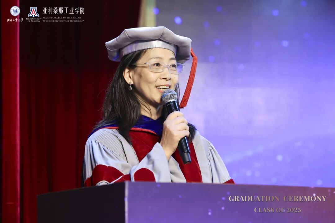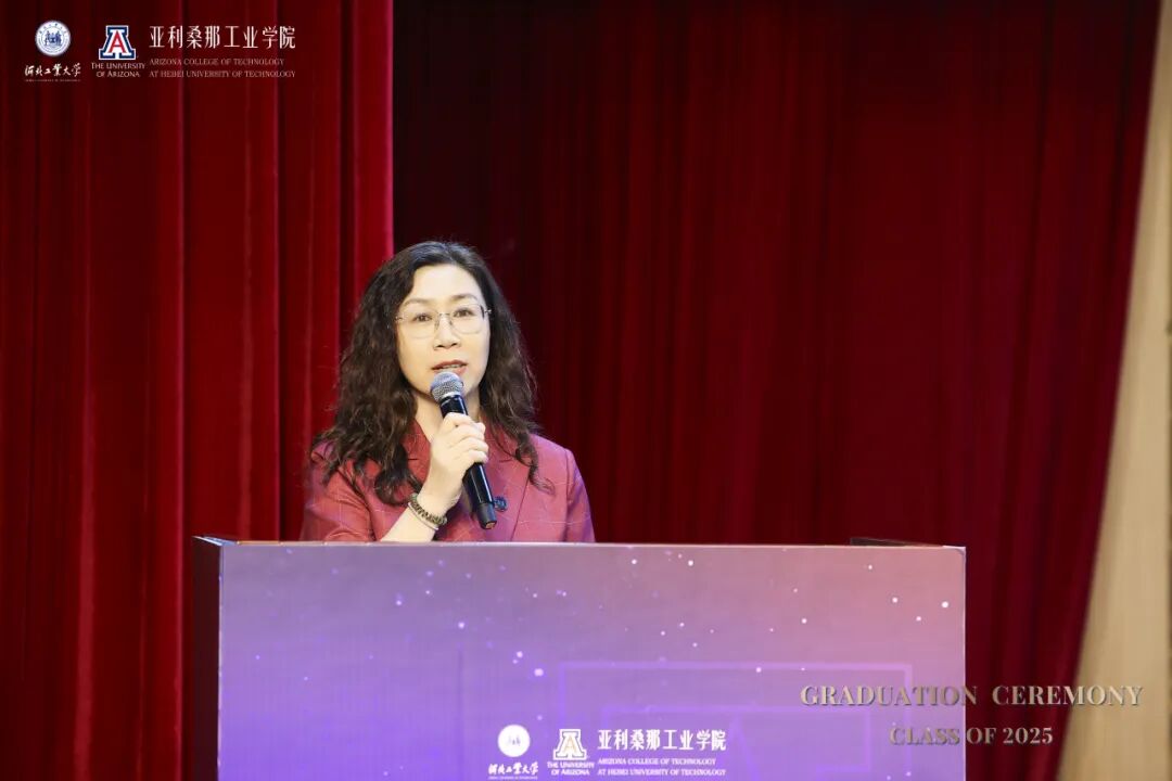 澳门美高梅 副校长兼国际教育机构党委书记陈鸿雁在致辞中回顾了毕业生四年的蜕变历程。她犹记得初入校园为他们来讲“开学第一课”,彼时在座新生们的眼神里充满了对未来的好奇和渴望。这四年来,在课堂讨论、实验室攻坚、项目实践、国际交流中展现出他们的卓越风采。她特别感谢了中美两校教师的辛勤付出以及亚利桑那大学代表团不远万里前来见证这一重要时刻。她寄语2025届毕业生要永葆好奇与热忱,以双校赋予的智慧为灯塔,在未来道路中开拓更广阔的天地。
