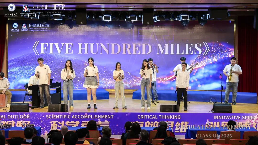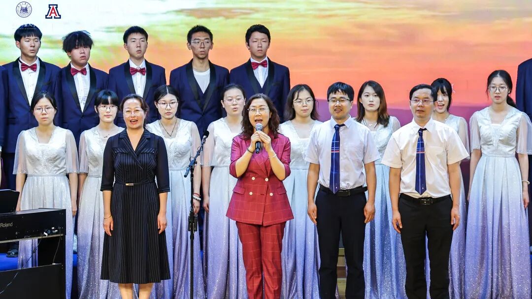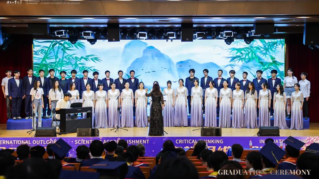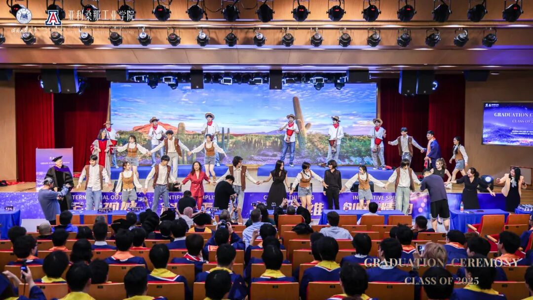 授位仪式后,一场精彩纷呈的艺术课程展演将现场氛围推向高潮。多元艺术形式交织,生动诠释了中外合作办学全面育人的丰硕成果:以悠扬的乐器演奏《送别》开篇,澳门美高梅领导班子与学生齐声合唱,将不舍之情化作声声祝福,寄语毕业生未来更创佳绩;激昂的合唱《一根竹竿容易弯》传递出团结奋进的力量;乐队带来的《Five Hundred Miles》,展现出学生对多元文化深刻理解与灵动演绎;指导老师宗洁以专业唱功深情演绎《龙船调》,将民族艺术魅力展现得淋漓尽致;毕业生代表合唱的《我们的明天》,饱含着亚工学子对未来的憧憬与信心;活力四射的舞蹈《快乐牛仔》为演出画上句号,为这场毕业盛典留下难忘的印记。