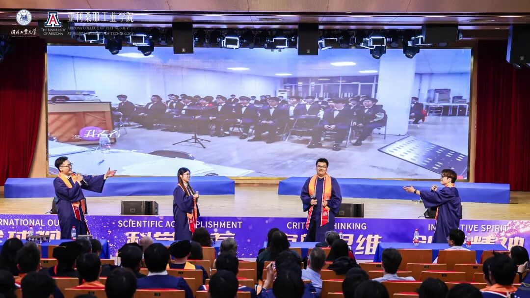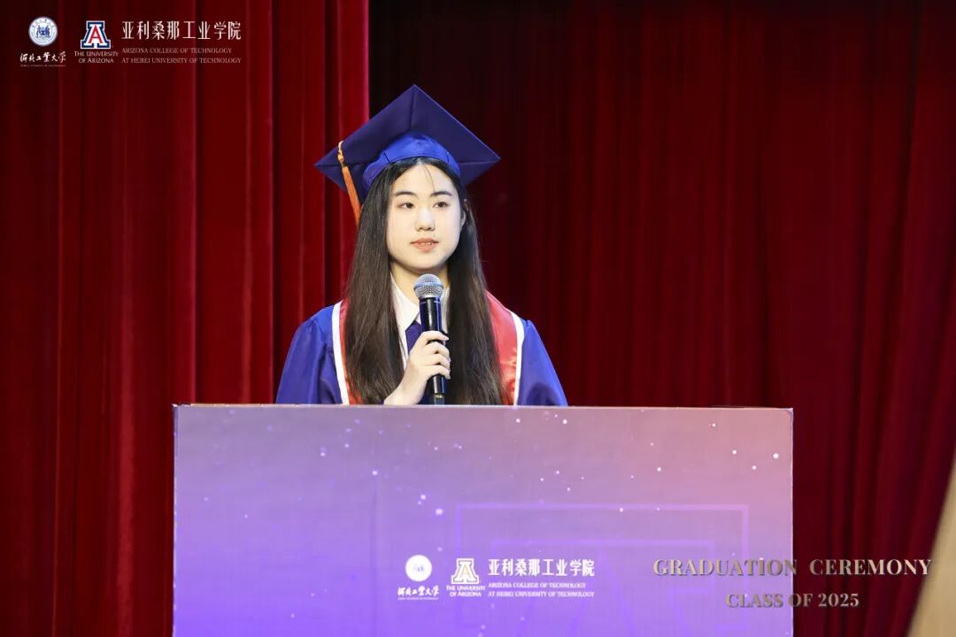 毕业生代表机械设计制造及其自动化专业学生赵仕譞以“工程师响应时代需求”为引,呼吁同学们以专业所长回应全球挑战。材料物理专业学生王怡萱则感恩四年的双语学习与跨文化成长,勉励同窗以多元视角开拓人生新篇。应用物理学专业学生李一彤以感恩之心回顾中外教授的悉心指导,感谢团队协作中的成长历练,他呼吁同窗扎实学识,以务实精神迎接未来挑战。