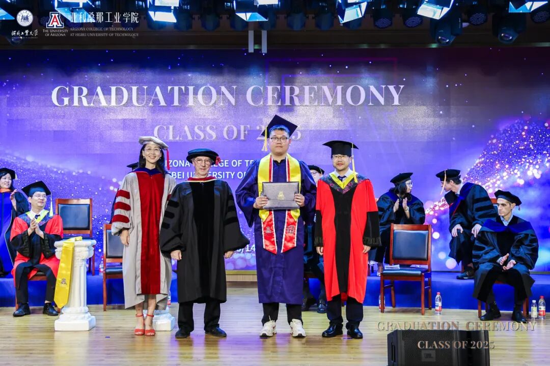 在庄严的授位仪式上,Xuejing Wang、Guiru Liu、Fuguang Cao三位教授宣读名单,中方院长卿龙邦、美方院长Philip Nash与各专业系主任为学生颁发学位证,2025届毕业生依次走上舞台,迎来他们人生的重要一刻。