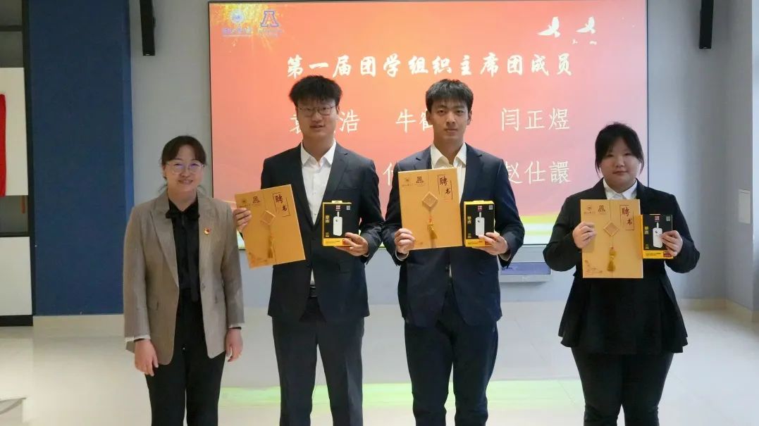辅导员王彦凯宣读第一届团学组织优秀部长、优秀部员名单,指导老师李梦雪、白慧、刘宏吉、张佳琛为获奖成员颁奖,赞扬他们的责任与付出。